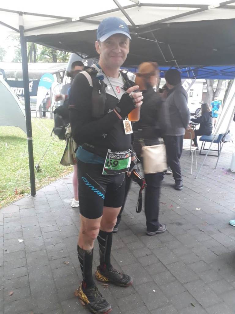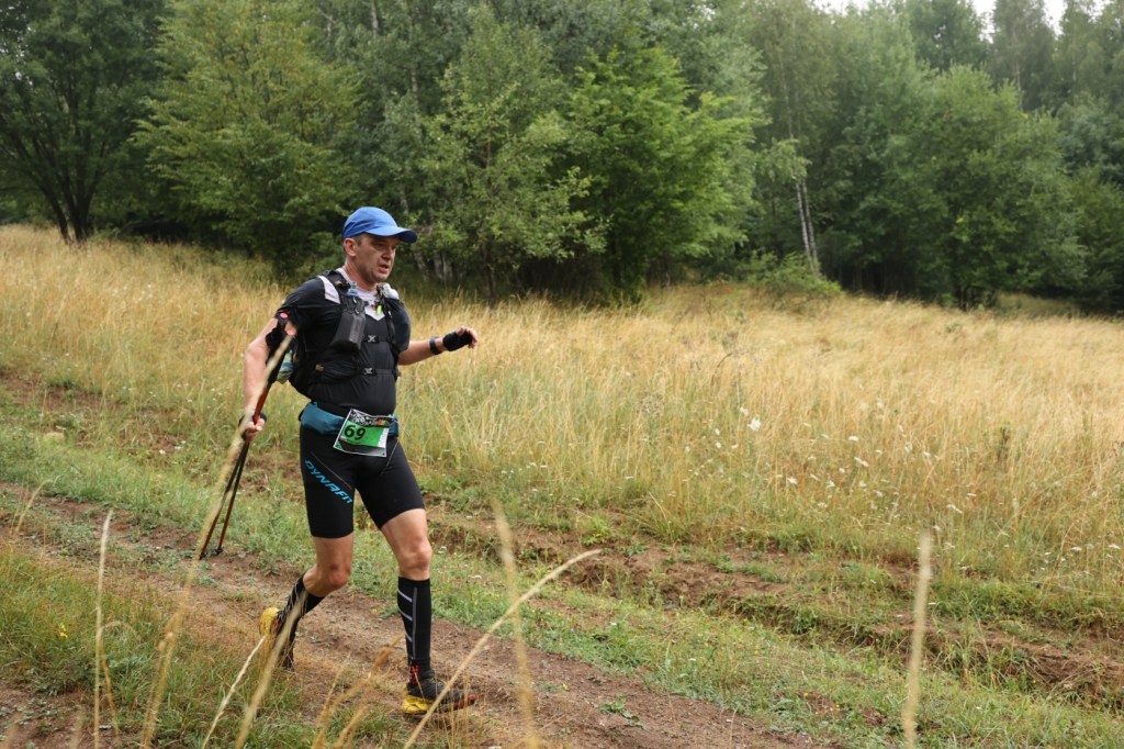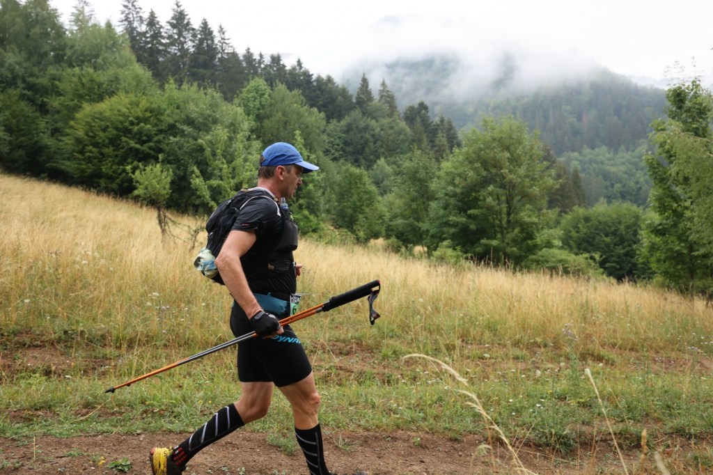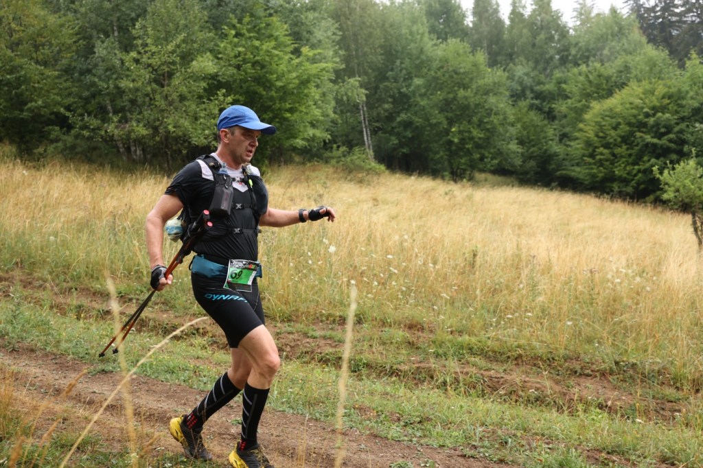 Zastávka bola opäť iba na nutné doplnenie tekutín, zjedol som pár chlebov s masťou a nátierkami, vypil nealko pivo a vydal sa hore na Ploskú. Išiel som si svojím tempom, hoci už začínalo mrholiť. Tešil som sa na zbeh z Ploskej, ktorý býva za sucha rýchly a behateľný, no tu už bolo blato a šmýkalo sa aj na mokrej tráve, a tak som si ho neužil. K tomu prišiel hustý dážď, ktorý komplikoval beh aj na úsekoch, kde sa vlani dalo pekne a rýchlo bežať. Teraz na singlových trailoch stála alebo tiekla voda, tak polovica energie nešla na smer dopredu, ale na samotné udržanie sa na nohách. Pod Minčolom už začalo pršať poriadne, musel som si obliecť znova bundu a po tečúcich potokoch som sa vybral na Rakytov. Ten bol pre mňa jedným zo strašiakov na trati, teraz ho kvôli hmle a hustému dažďu ani vidno nebolo, tak som sa aspoň nemusel pozerať, aké stúpanie ma čaká. Vždy si vravím, že dážď je trest za pomalé tempo. Zrejme tí prví to stihli ešte pred ním. Už som vedel, že akékoľvek ambície na cieľový čas a prepočty medzičasov sú zbytočné, tak som len išiel vpred, aby som došiel do cieľa a vyhol sa spomínanej skratke DNF. Kilometre v daždi medzi 30 a 35 mi ubiehali strašne pomaly, často som si myslel, že sa mi stratil GPS signál, keď nič na displeji nepribúdalo. Obehlo ma aj dosť bežcov, chvíľku som sa „zviezol“ s Florianom Kevickým. Tento tretí “stint” si do výkladu nedám.