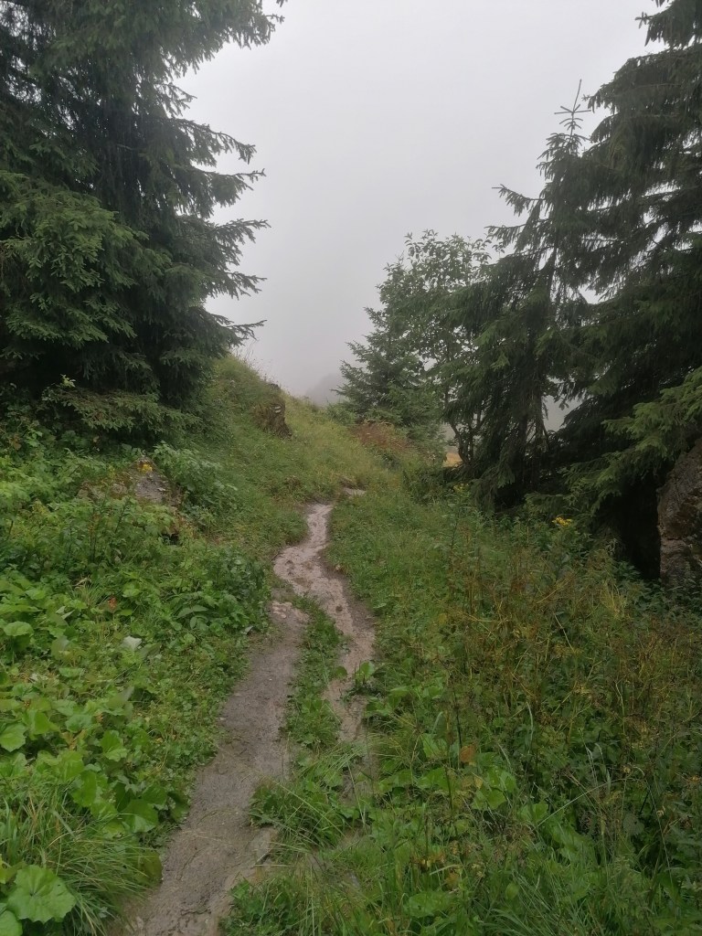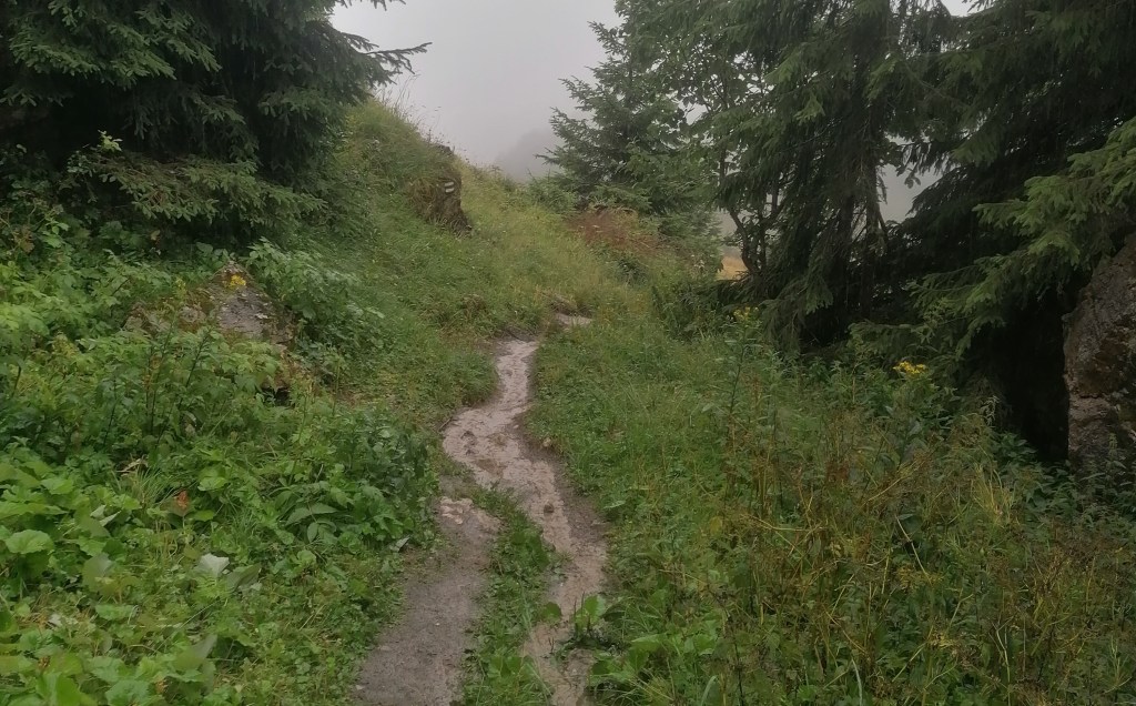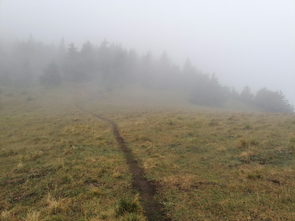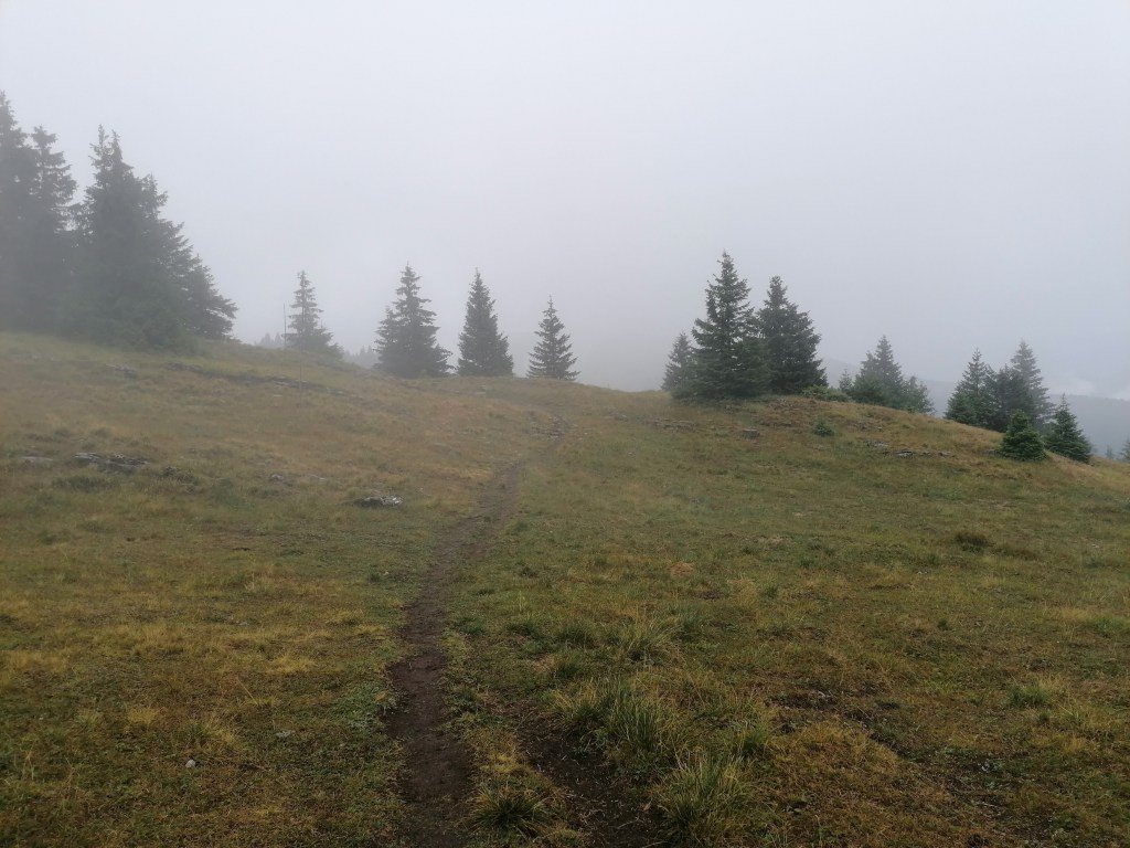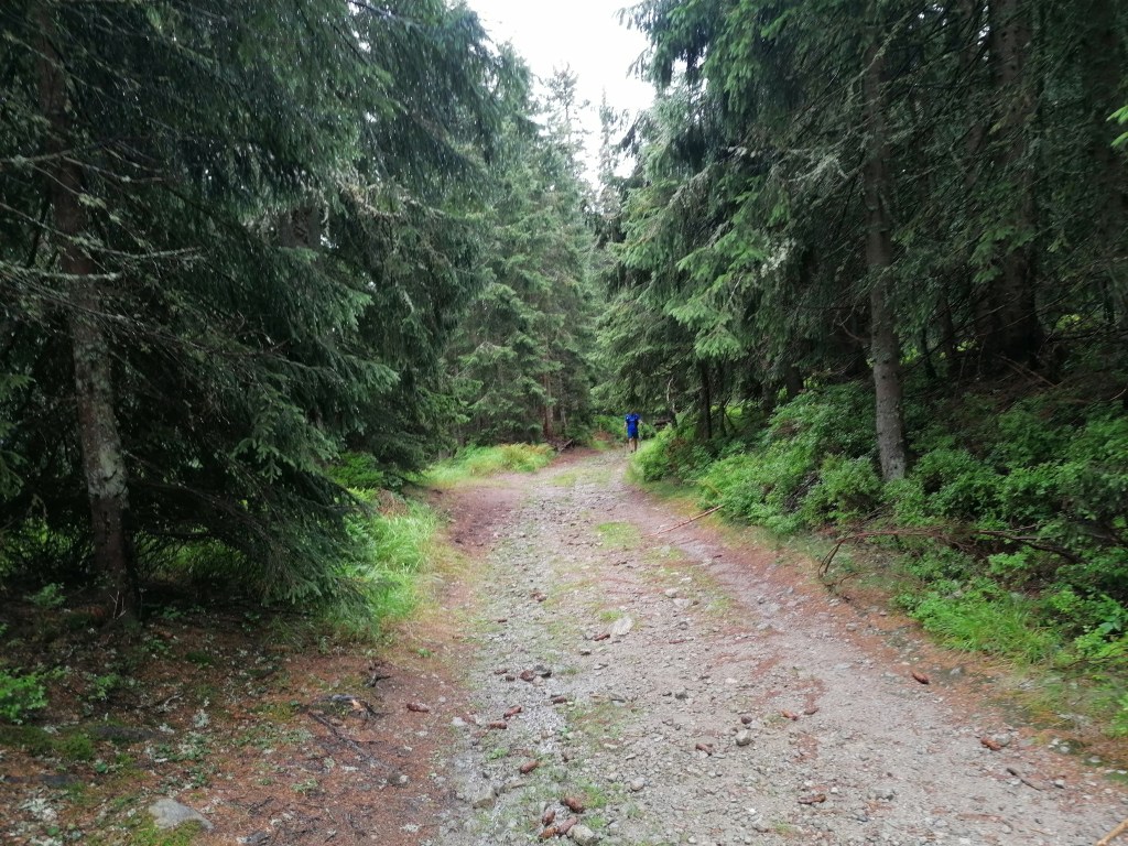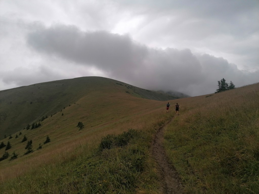 Stúpanie na Malú Smrekovicu je ideálne na zahriatie vychladnutých nôh po bufete. Po zelenej značke smerom na Šiprúnske sedlá sa po zvlnenom teréne a prevahou klesaní bežalo celkom fajn, hoci znova som ostal sám. Opäť začalo hustejšie pršať a bahno na zvážnici pod Vtáčnikom už bolo hlboké a nepríjemné. Zatiaľ som sa však stále – aj za pomoci palíc v klzkých zbehoch – zostával čistý a bez pádu, hoci pri niektorých pokĺznutiach som mal na mále.
