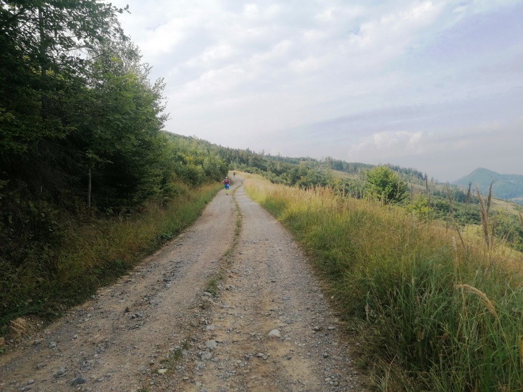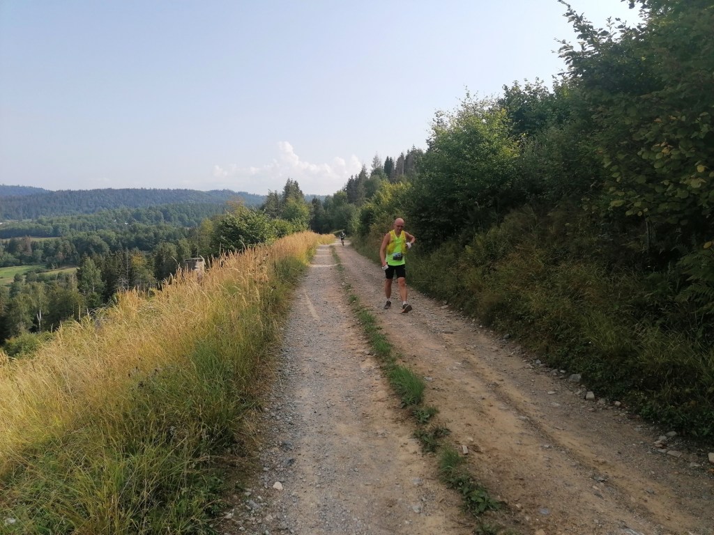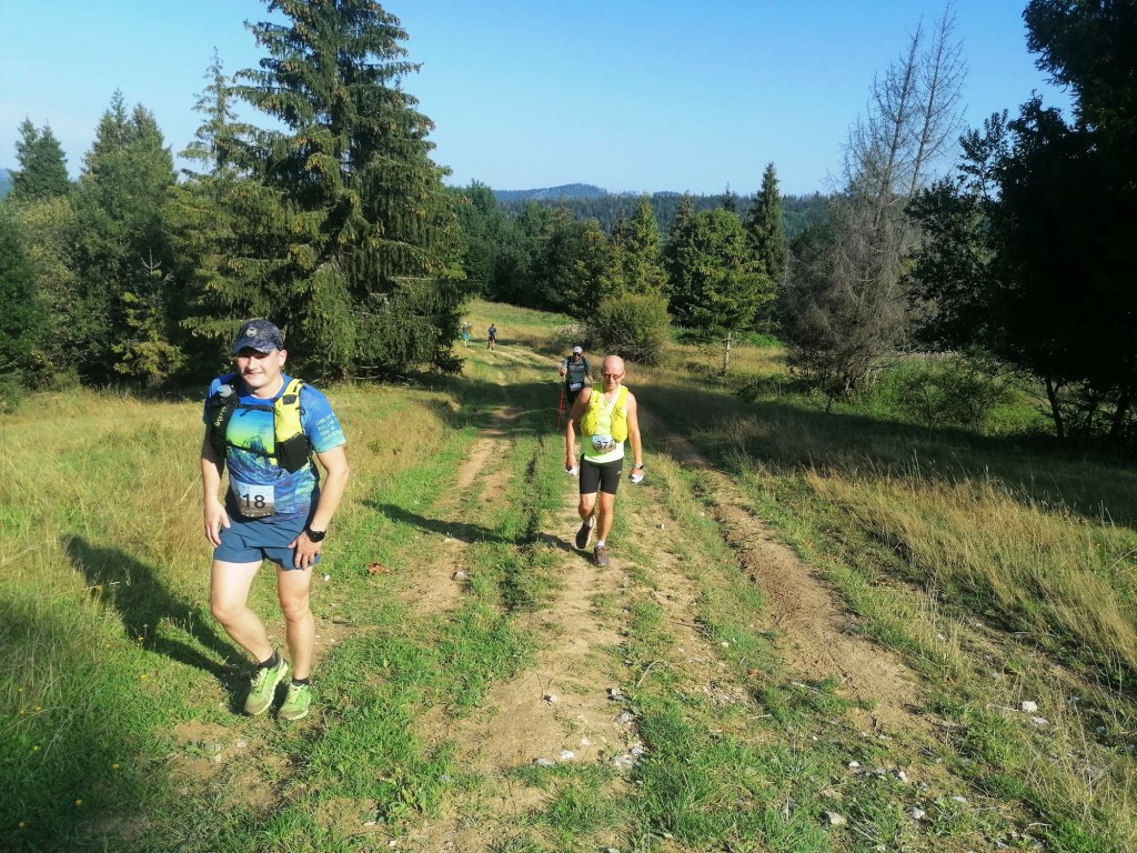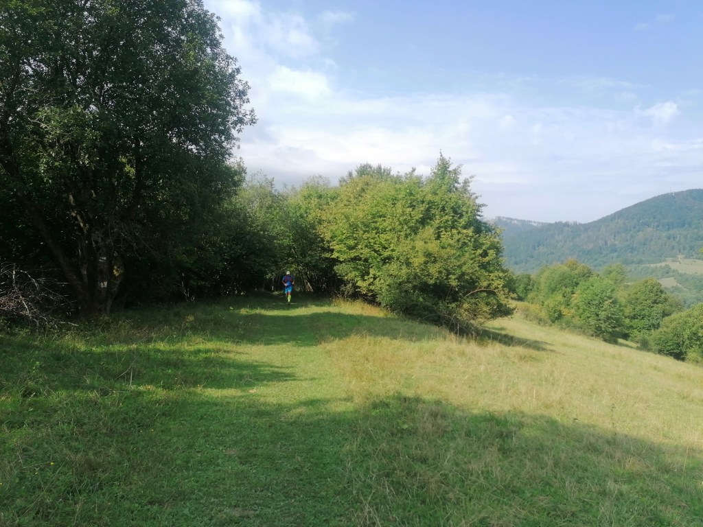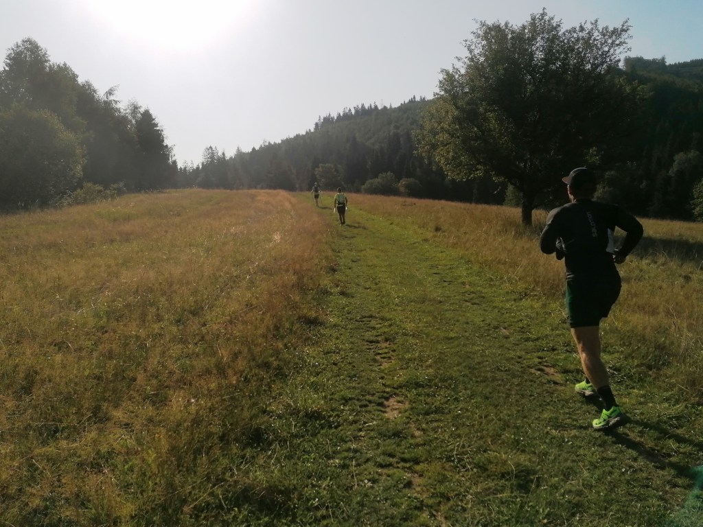 Keď sa cesta po zhruba piatich kilometroch zdvihla do tiahlej zvážnice, tempo som nezvoľnil. Podobné sklony kopcov okolo 5-7 % mám rád, tvoria väčšinu mojich tréningov a zrazu som zistil, že za mnou zostala diera a skupina kamošov bola za mnou v nedohľadne. Tým, že prvá tretina trate bola ľahšia a behateľná, nechcel som sa už zdržiavať čakaním, radšej som išiel svojim komfortným tempom, aby som si na cieľový limit vytvoril dostatočný náskok pre prípad možnej krízy. Dávno mi prvých 20 km po prvý bufet neubehlo tak rýchlo a dávno som nemal na ultra behoch kilometrové medzičasy okolo 5 minút a navyše bez výraznejšieho úsilia a stále s úsmevom a v dobrej nálade. Navyše vo veľmi peknom prostredí, kde sa striedali lesné cesty, drevené lavičky, mierne zbehy a lúky.