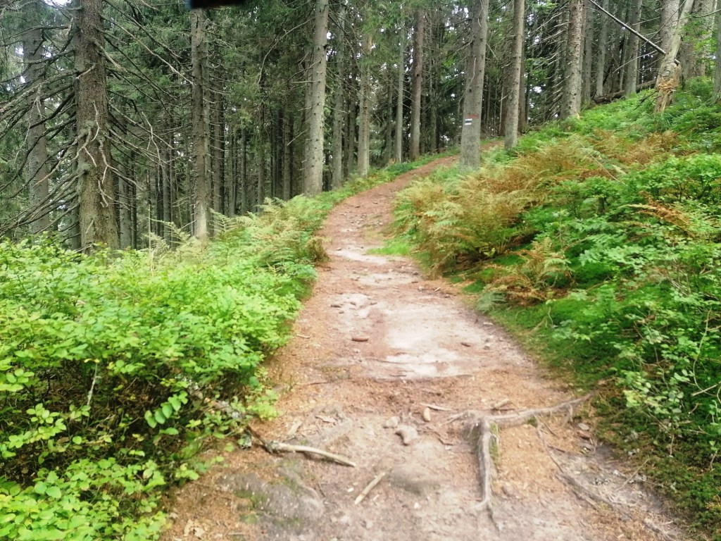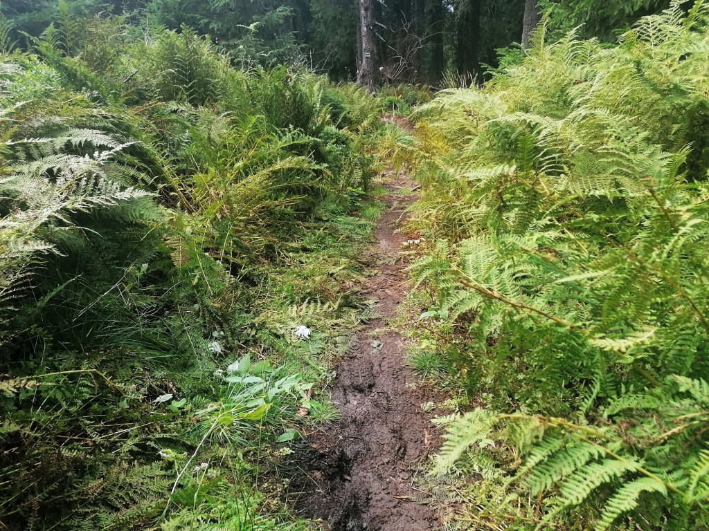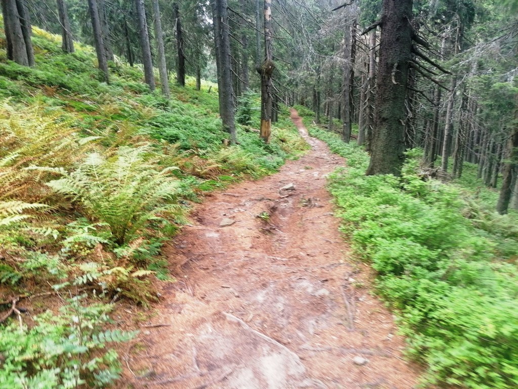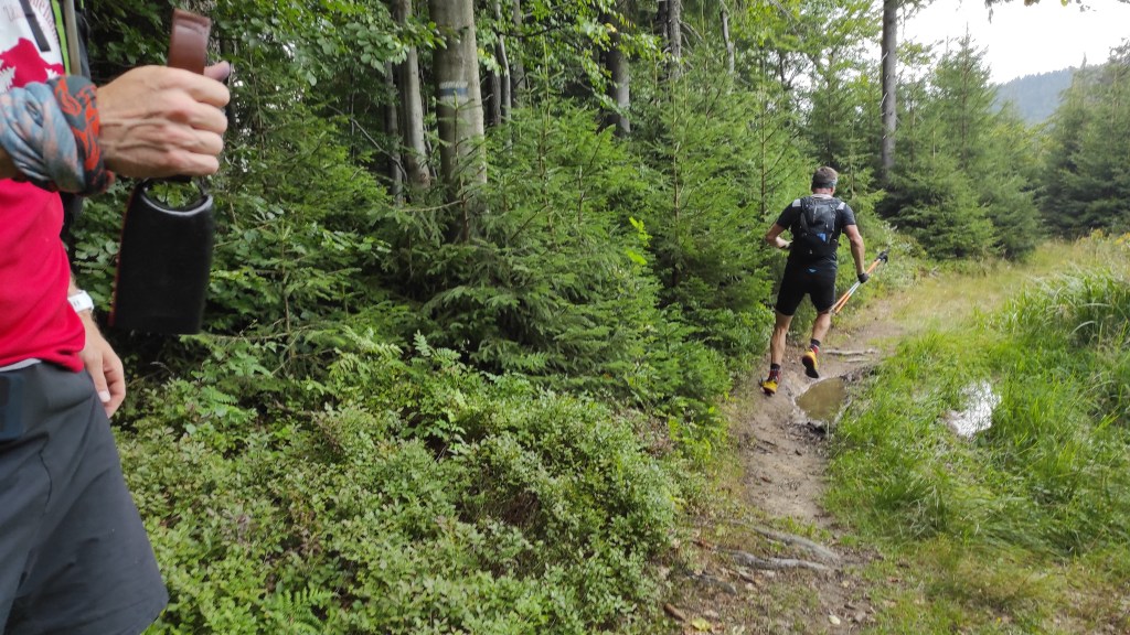 Dážď zosilnel a búrka už bola blízko. Našťastie ma nechytila na otvorenom priestranstve. Preventívne som si obliekol aj pláštenku, palice chytil za gumené rukoväte, držal ich nad zemou a aj som sa snažil bežať, aby som nemal v žiadnom momente obe nohy na zemi. Lízol ma iba okraj búrky a po chvíli išla pláštenka dolu. Dobehla ma dvojica Lenka Klusová a Michal Holý, s ktorými som sa držal v slalome pomedzi mokré paprade a čučoriedky až do poslednej občerstvovačky. Raz ma pokrikom zachránili od blúdenia, keď som sa pred nimi rozbehol a prešvihol nenápadnú odbočku.