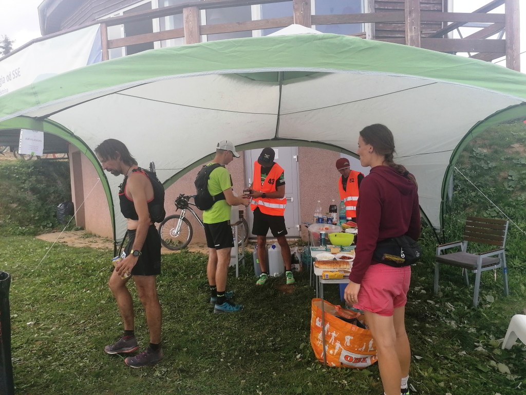 Už som sa poučil, že na bufetoch sa veľmi nemám zdržovať. Prvou kontrolou som len preletel, vodu som mal a aj prvú občerstvovačku som vybavil do piatich minút. Bežal som s dvoma pollitrovými fľašami s jonťákmi. Teplota cez deň síce nebola úplne ideálna na beh, ale neboli to žiadne extrémne teplá, takže dodatočný hydrovak som nebral a práve ten liter vody mi skoro vždy vydržal do ďalšieho bufetu. Ani som veľa nejedol. Na každom bufete jeden chlieb s masťou alebo nátierkou, pohár koly a radlera, občas banán alebo melón.