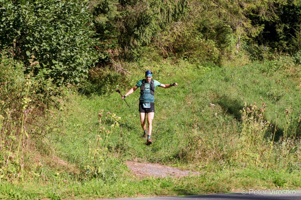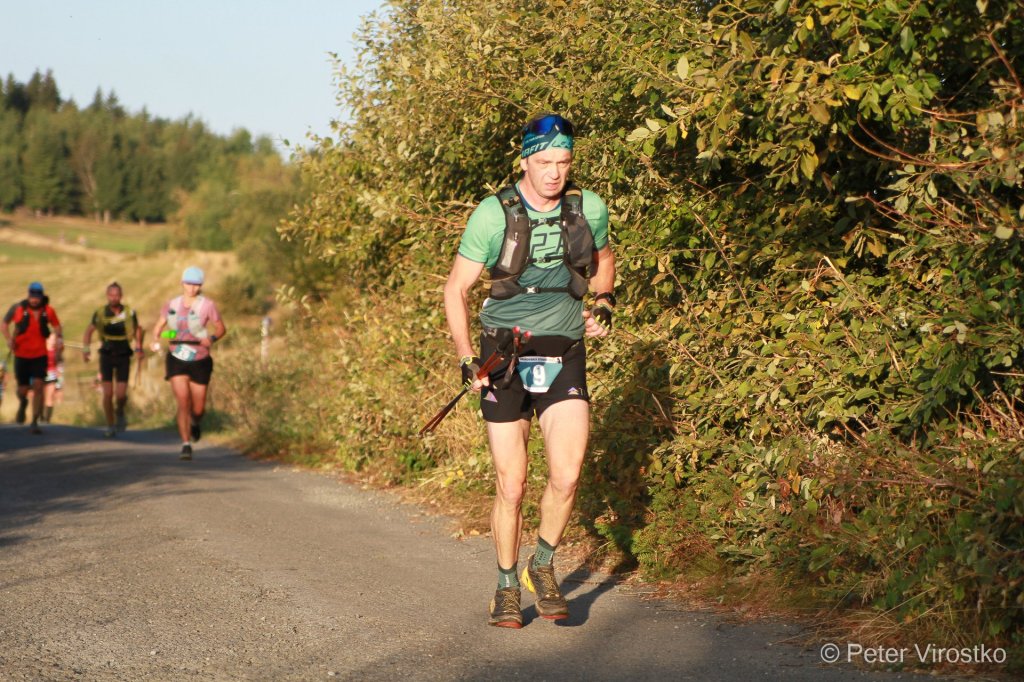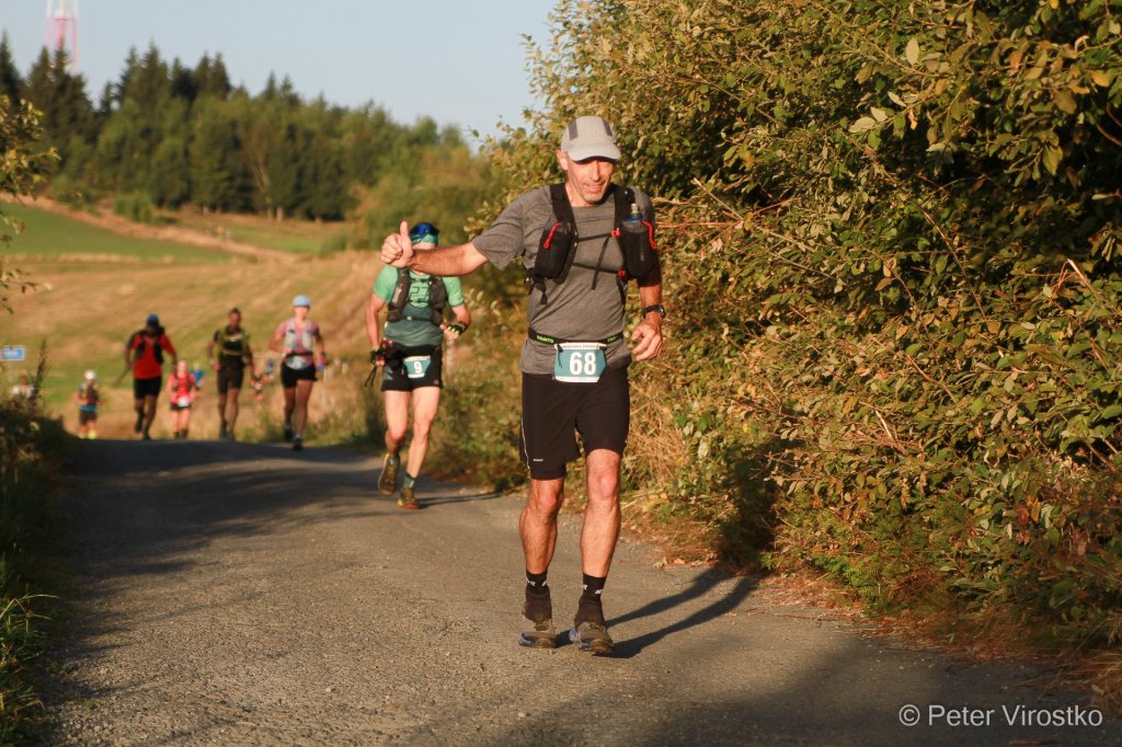Zbeh z Drahovej mi veľmi nesedel. Bežalo sa po veľmi úzkom chodníku tesne vedľa elektrického ohradníka, potom to vymenili popadané stromy, ktoré bolo treba preskakovať, či podliezať a nejako som sa nevedel dostať do tempa. K tomu som už začínal aj cítiť nohy a prišli prvé náznaky krízy. Začalo už aj celkom slušne piecť slnko a na otvorených úsekoch postupne žmýkalo energiu. Na bufet v Havrilove som dorazil smädný, asi bolo chybou, že som exol pár pohárov koly a radlera bez toho, aby som ich nechal vybublinkovať a aby som nestratil veľa času, pomerne rýchlo som vybehol z občerstvovačky do dlhého tiahleho stúpania. Najprv krokom, kým si obsah v žalúdku našiel svoje miesto, potom som na miernejších úsekoch aj pobehol. V úsekoch medzi Cisárskou hoľou a Pasiečkami nás čakalo aj pár ostrých stúpaní, vtedy som zbadal, že som si palice nebral zbytočne. Na krátkom hrebeni okolo vyhliadky prišiel strmý zbeh, najprv dolu lúkou pomedzi paraglajdistov, potom lesným žľabom. Tu som začínal cítiť, že si bublinky z koly a radlera začali v mojom tráviacom trakte robiť súťaž v nafukovaní a praskaní balónov. Napriek tomu, že stehná stále držali a nemusel som brzdiť palicami, zbeh začínal trochu bolieť a miestami som kvôli krátkym kŕčom a nafúknutému bruchu nemohol uvoľniť a natiahnuť krok a obehlo ma viacero bežcov a skupinka s Majkou Kubovou. Nemohol som sa dočkať bufetu v Kokave nad Rimavicou na 50. kilometri.